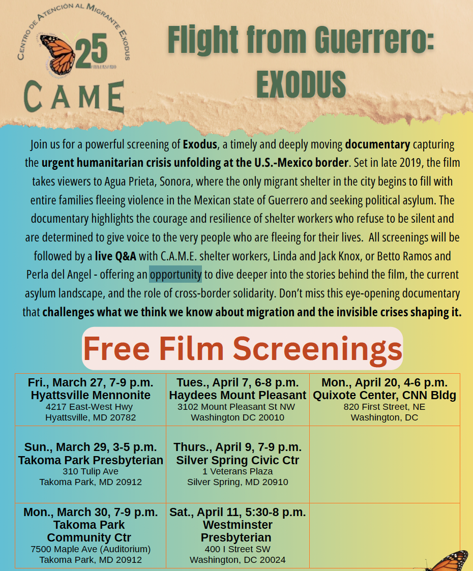 This event will include a simple meal during the screening which will then be followed by a live Q&A with C.A.M.E. shelter Director Betto and his wife, Perla, a civil rights attorney, offering an opportunity to dive deeper into the stories behind the film, the current asylum landscape, and the role of cross-border solidarity. Don’t miss this eye-opening documentary and discussion that challenges what we think we know about migration and the invisible crises shaping it.