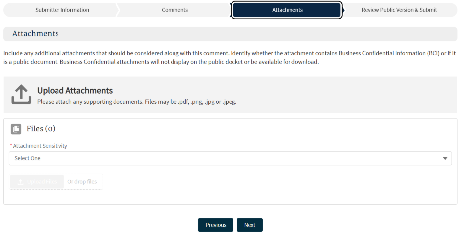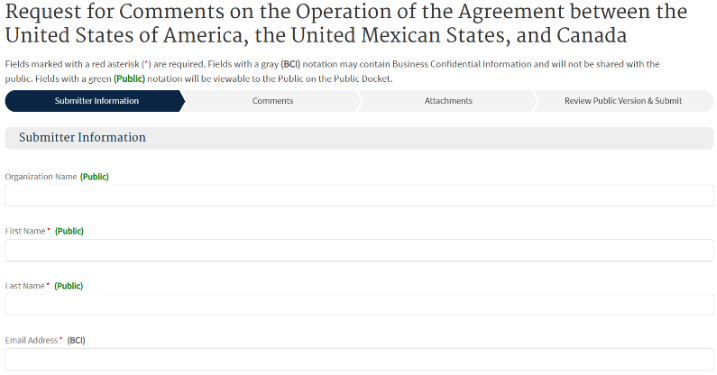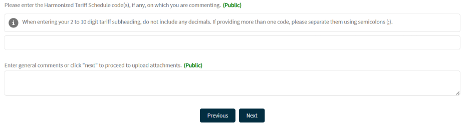 Enter your comments in the general comments text box at the bottom of the page, the first text box is optional, for Harmonized Tariff Schedule codes if any – your general comment must be entered in the second text box.