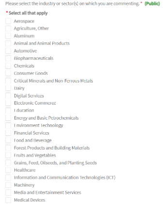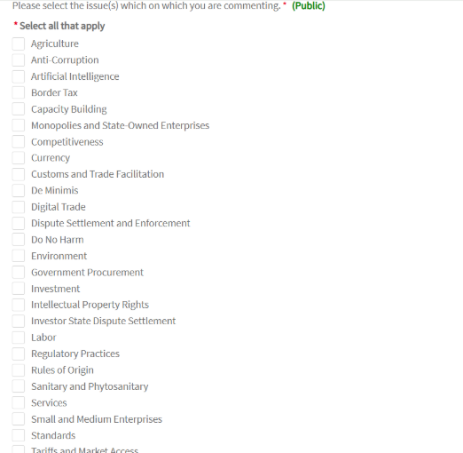 ** Every comment submitted to the USTR must specify the Chapter, the Industry/Sectors and the Issue it pertains to – Below we suggest which chapters, industries/sectors and issues correspond to the proposed comments**