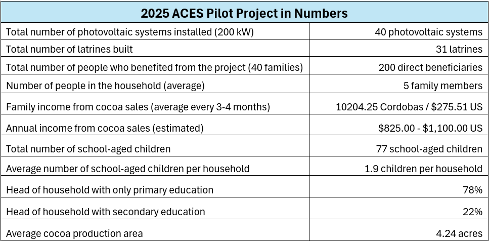 Because most CacaoNica members live on remote, scattered farms beyond the reach of the electric grid, access to electricity had long been out of reach. Through the ACES pilot, 40 families received 200kW photovoltaic solar systems. For the first time, their homes can stay lit after sunset. They can charge their cellphones. They can now consistently use soil quality and humidity tools, essential for meeting certification standards. Reliable, clean energy not only improved living conditions but also increased productivity and expanded what families could imagine for their futures.
