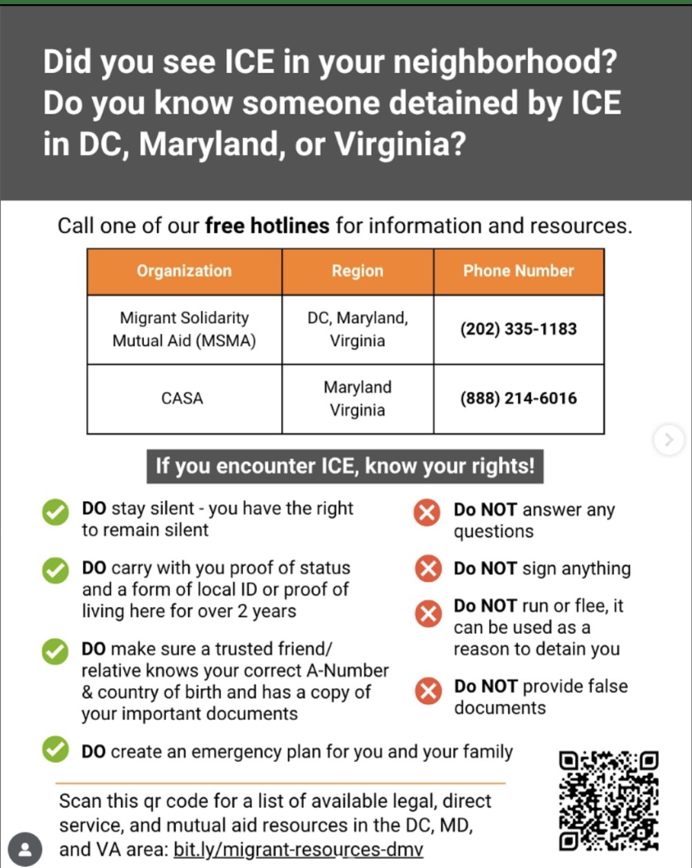 Local mutual aid group Migrant Solidarity Mutual Aid in Washington, DC runs an ICE watch hotline and stewards resources to families in need. They have an excellent repository of immigrant resources for those in the Washington, DC metropolitan region.