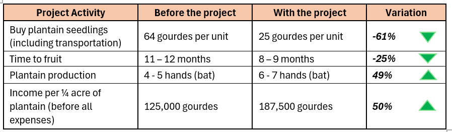 The PIF technique for plantain production reduces the cost of production per hectare (2.47 acres) of cultivated land by 60% and reduces the time to reach peak production by two months. It is worth mentioning that it is rare for one single farmer to have an entire hectare of land; normally we see 5 or 6 farmers farming per hectare. Having more high quality, healthy plantain seedlings available locally is an opportunity for our partners to boost food security in the region. Our partners report that with this project, farmers earn an additional 62,500 gourdes, if they always follow all the principles for good production. This figure represents a minimum increase of 50% profit over the old production method.