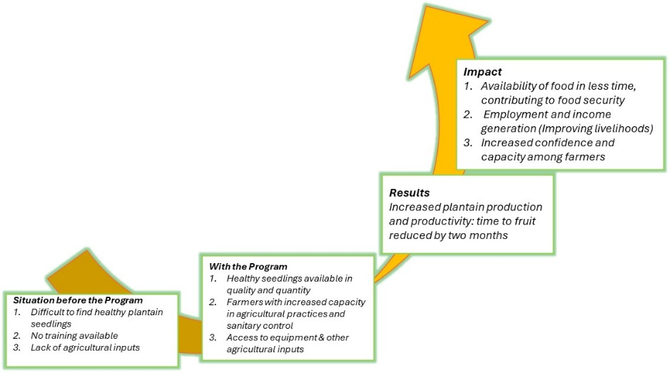 - 6 training sessions reaching 34 farmers and planting 3000 plantain trees using the PFI technique, increasing the availability of good quality trees.
