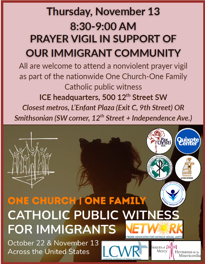 As part of the nationwide One Church One Family Catholic public witness for immigrants, join Quixote Center and other faith groups for a solemn, nonviolent vigil outside the headquarters of the Immigration and Customs Enforcement (ICE) agency. For more information click HERE.