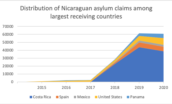 It is also instructive to compare the number of asylum claims vs the total number of people migrating. Doing so makes clear that asylum is not the main reason people are leaving Nicaragua - not even during the worst of the political conflict. The case of Costa Rica is somewhat unusual but still instructive. The tens of thousands of asylum claims from Nicaraguans in Costa Rica need to be viewed alongside the annual 800,000+ border crossings between Nicaragua and Costa Rica that were the norm before COVID-19 as Nicaraguans routinely sought temporary work in Costa Rica. Indeed, the majority of asylum claims in 2018 were from people already living in Costa Rica at the time of the crisis who did not want to return. They were not all people fleeing the turmoil, though clearly many did not want to be pushed into it.