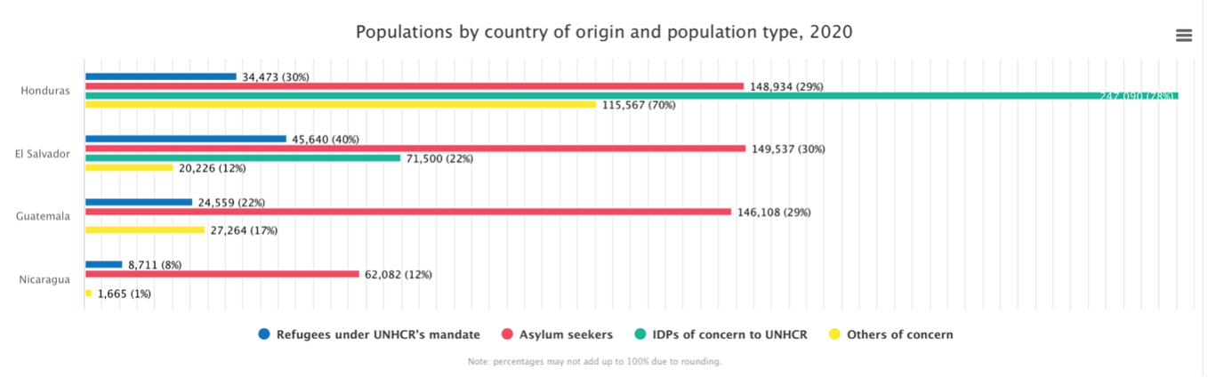 As high as these numbers have been by Nicaragua’s recent standards, when compared to other countries in Central America the figures are low. The chart below shows UN data for different categories of forced migration, internal and external, in Central America for 2020. Not only is Nicaragua well below all of its northern regional neighbors concerning the number of people seeking asylum, and/or claiming refugee status, there is basically no internal displacement, and few “other” categories of concern in Nicaragua. Compare this to Honduras, for example, where internal displacement approaches 250,000 people on top of the 180,000 combined asylum and refugee claims.