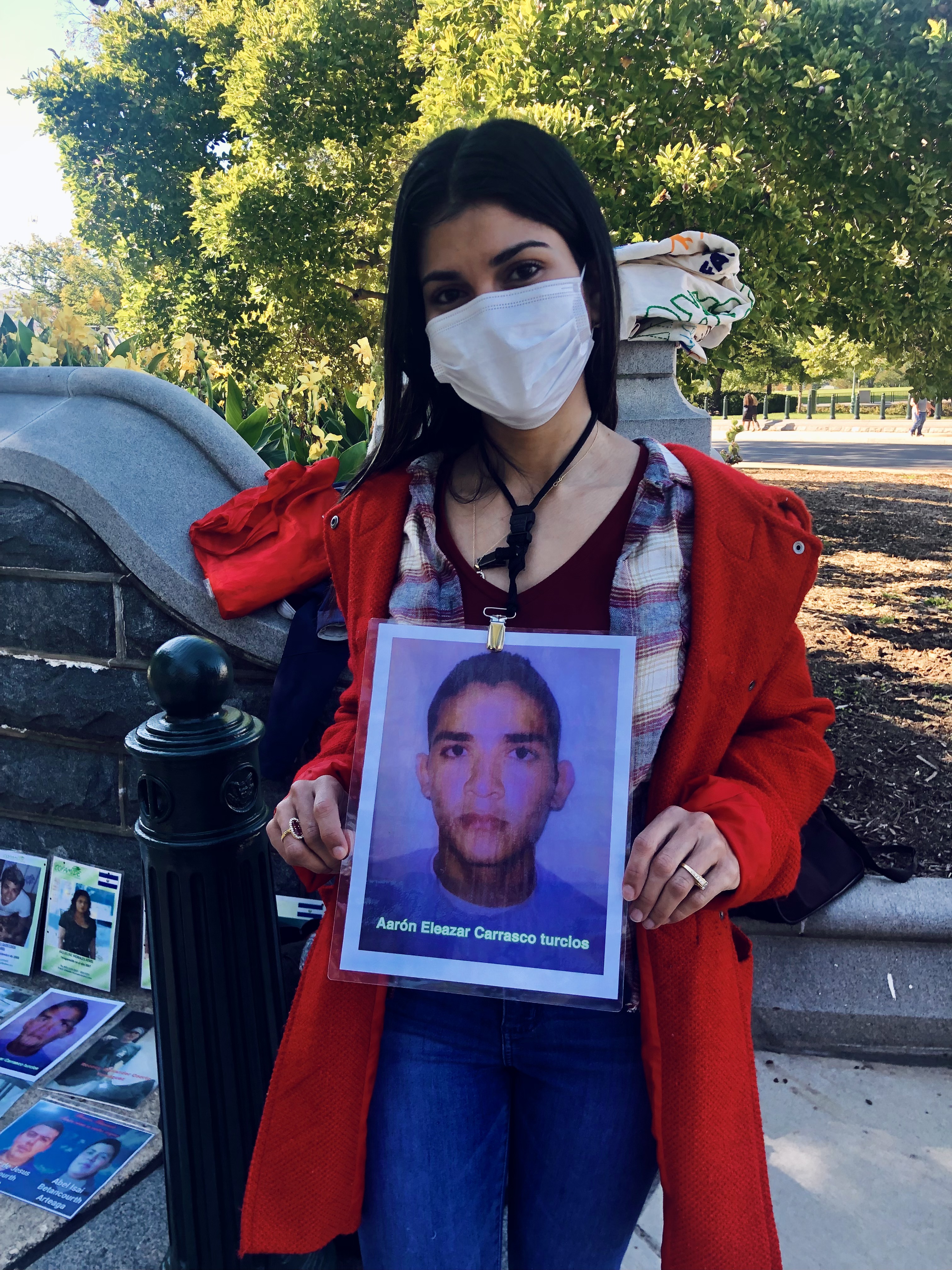 Karen poses for a picture with the photograph of her brother Aarón, who has been missing since 2012.[/caption]